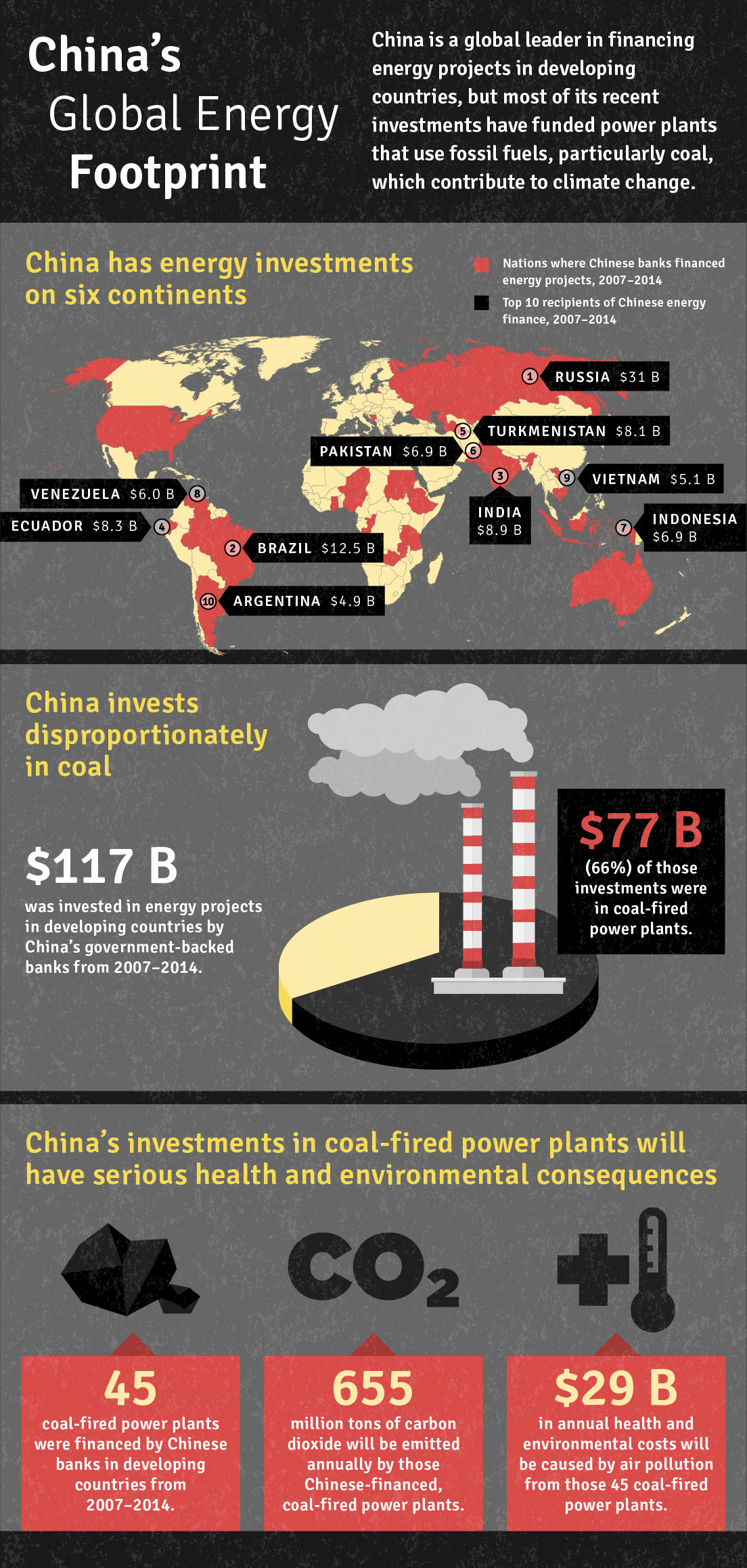 The influx of Chinese financing will increase access to energy in developing countries, where more than 1 billion people lack access to modern electricity. The drawback: two-thirds of China’s energy financing from 2007-2014 funded coal-fired power plants, coal mines and large hydropower dams, which the study said would exacerbate climate change and deforestation in the Amazon.