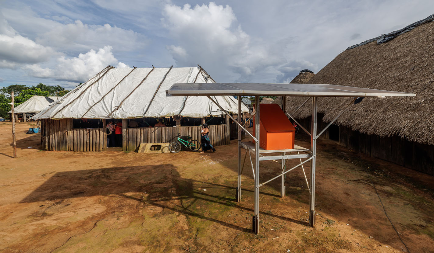 Fotografia: Jenifer VelosoPlacas solares individuais foram instaladas atrás das casas na aldeia Khikatxi.